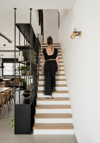 התהליך- בתכנון הבית בחרנו ביחד עם הלקוחות שלנו קווים נקיים ושילוב בין נגרות בהתאמה אישית לבין ריהוט מינימליסטי. ספריית המתכת בכניסה לבית תוכננה כרהיט שמהווה חוצץ עיצובי וגם אלמנט פונקציונלי בין החללים, ומלווה את גרם המדרגות באופן אלגנטי.